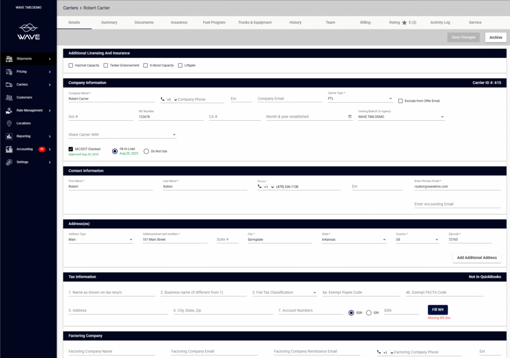 - Centralized carrier profiles with contacts, equipment, documents, insurance, and shipment history