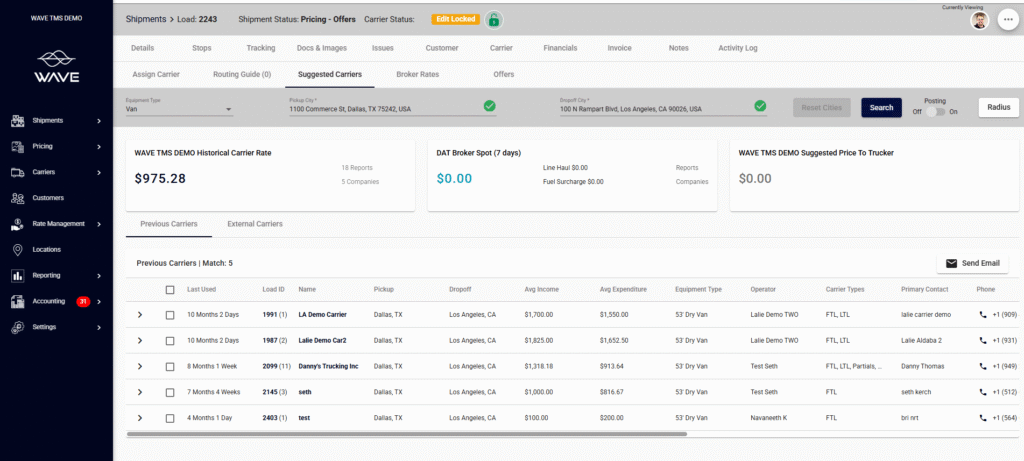 - Carrier search and sourcing by lane history, geography, rates, availability, and prior performance